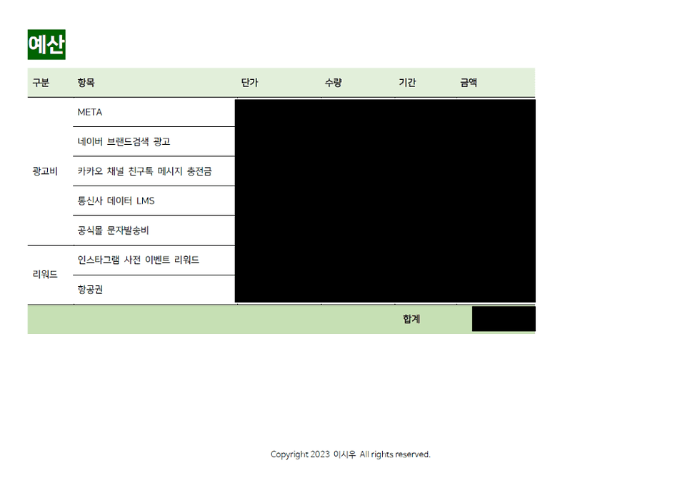 미디어믹스가 필요없을 경우에는 '예산' 항목으로 대체한다. 본 프로젝트를 진행하기 위해 발생하는 모든 버짓을 구분, 항목, 단가, 수량(기간), 금액으로 정리한다. 또한 미디어믹스 항목이 없을 경우 이 장표에서 예산과 예상 매출/수익을 도출해 ROI를 예상해 기대효과를 제시한다. (현 기획안에서는 미디어믹스 장표에 포함되었다.)